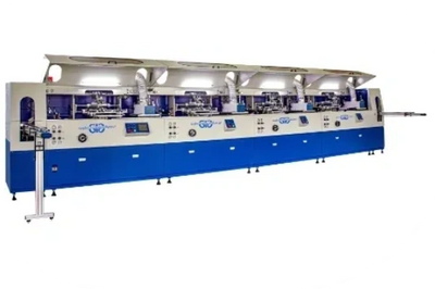 Fully versatile automatic bottle screen printer for all shapes. This machine is multi-station and can print up to 8 colors max on cylinders, ovals and flats.